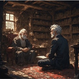 מול הבקתה הנידחת מצא עצמו הפרופסור מתרגש, לא מכך שגילה את אטלנטיס, לא מכך שחשף את העיר האבודה שאיש מעולם לא גילה, ולא, לא מכך שחיים שם תושבים רבים יותר משיכול היה לדמיין. דבר אחד ריגש אותו, לפי כל האגדות, בבקתה הזו, בפאתי העיר, חי הזקן החכם ביותר בעולם, נצר למשפחה מפוארה של חכמים. עוד שניה, עוד רגע קט וכל התעלומות, כל ייסורי הנפש וההתלבטויות יגיעו לקיצם. בלב פועם מהתרגשות, בחשש ובתקווה צעד הפרופסור אל מפתן הדלת, ידו שהורמה כדי לדפוק רעדה מהתרגשות ומצחו היה עטור זיעה. שלוש דפיקות הספיקו כדי לעורר את החכם הזקן שקרא מפנים הבית לאורח הנכבד להיכנס אל משכנו. מול החכם הזקן הרגיש אפילו הפרופסור צעיר בשנים רבות, בתוך הבקתה הפשוטה ידע הפרופסור שכאן בוודאי טמונה התשובה.