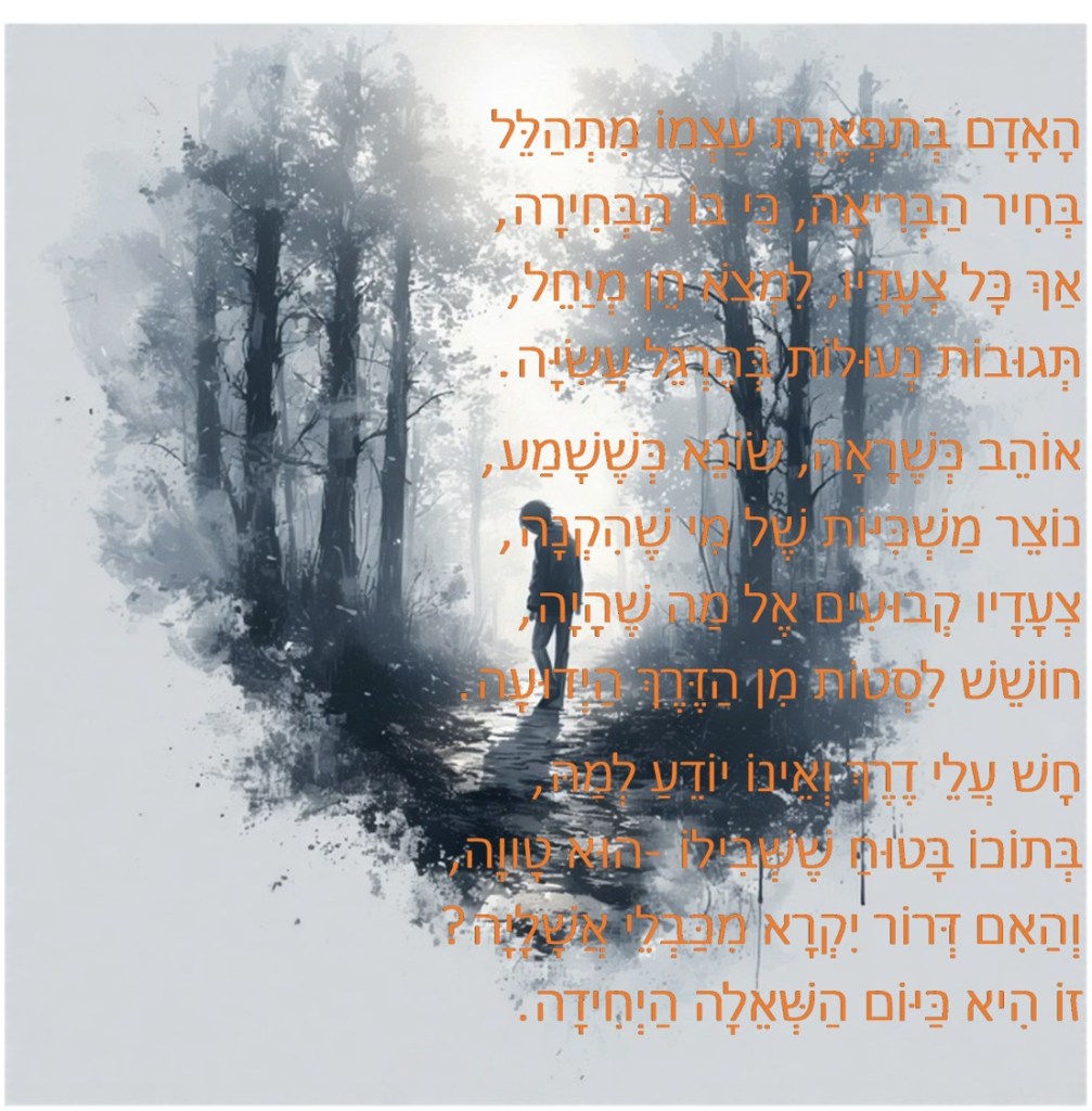 "אבל… היתכן?" התפרץ הפרופסור כתלמיד לא ממושמע, "ישנן הוכחות מוצקות כל-כל לכך שהאדם נטול בחירה, המדע גילה כה הרבה על…" הזקן הרים את ידו, עוצר אותו משטף דיבורו המהיר, "אתה צודק, ידידי, אתה צודק" אמר החכם הזקן. הפרופסור הביט בו בתמיהה, לא מבין לאן חותר הזקן. "אתה צודק" חזר החכם, "אתה צודק. כל מה שגילתם במדע- צודק, כל המחקרים שחקרתם- נכונים וכל ההוכחות- אמת. אבל זהו כלל לא סותר"